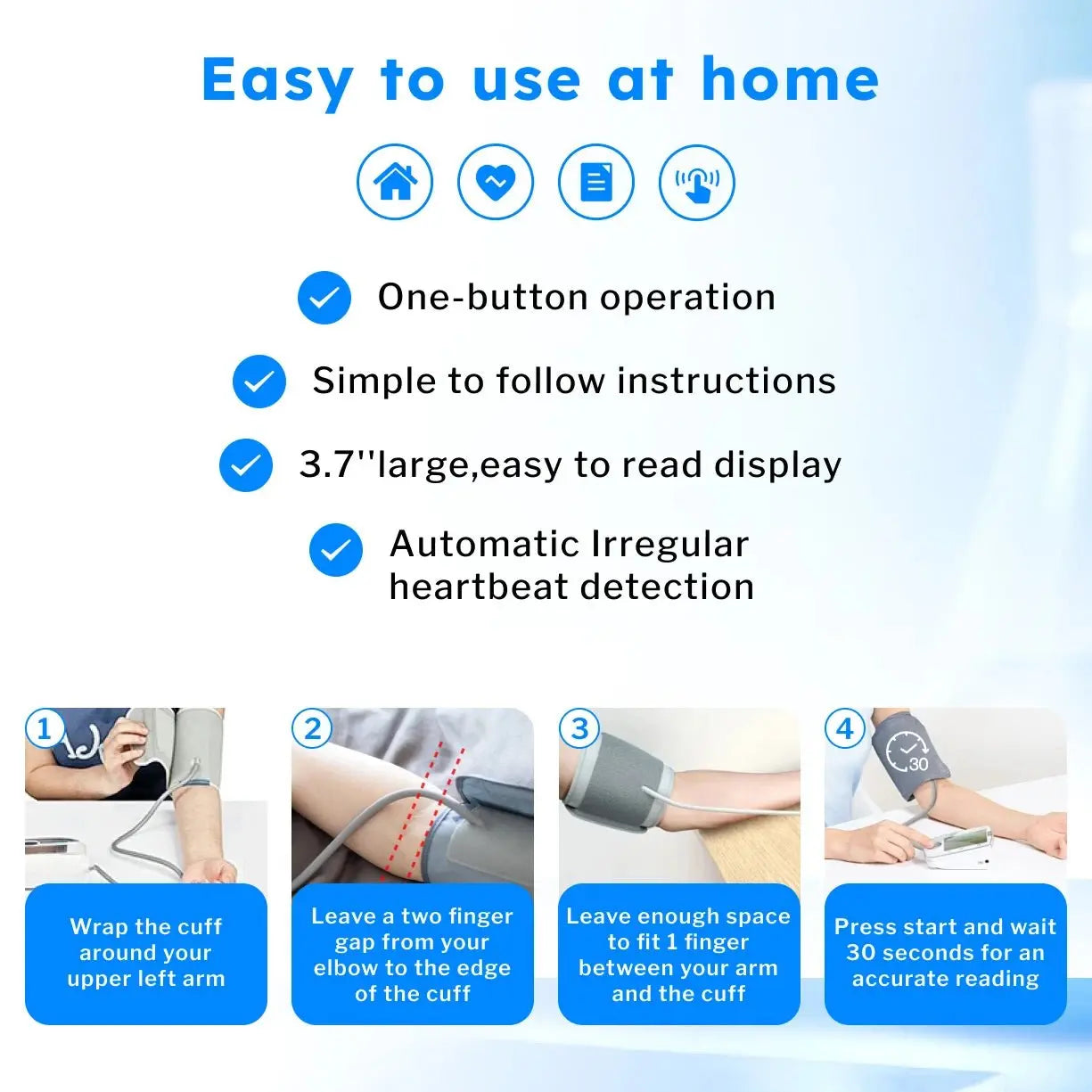 Cet appareil de mesure de la tension artérielle peut surveiller deux utilisateurs simultanément, enregistrer 50 mesures avec la date et l'heure pour chacune d'entre elles, afficher la moyenne des 3 dernières mesures et détecter les battements de cœur irréguliers. Aide les utilisateurs à suivre facilement leur santé, leur tension artérielle et leur rythme cardiaque en fonction de l'heure et de la date.