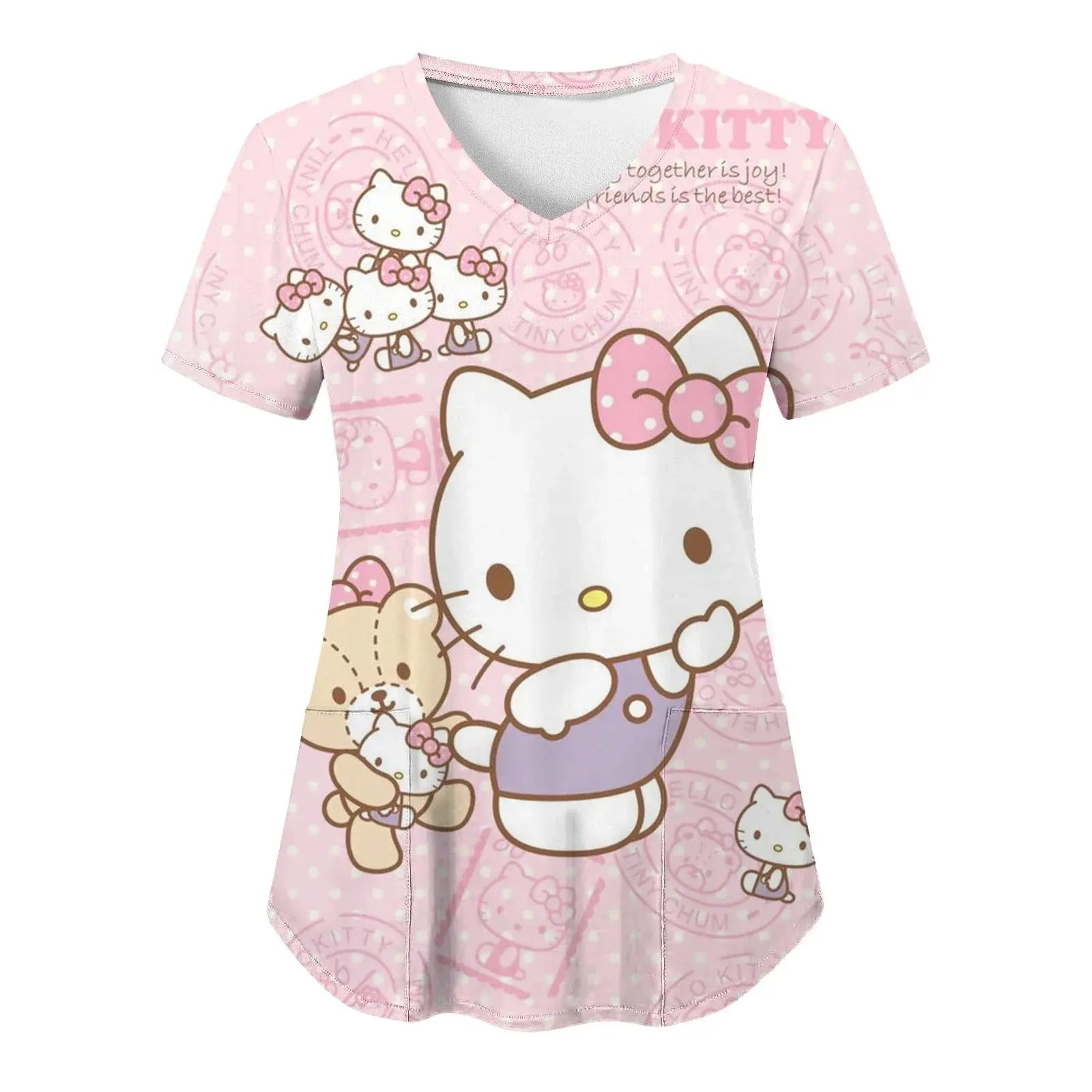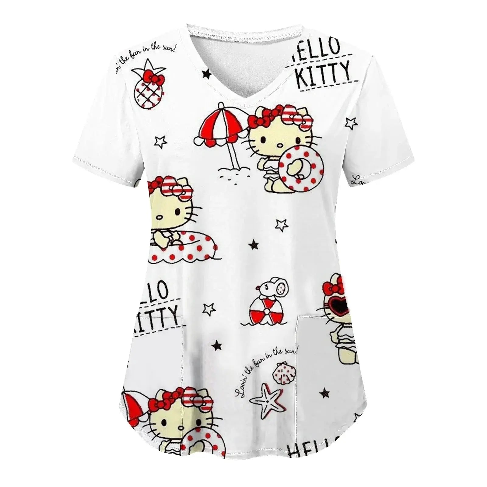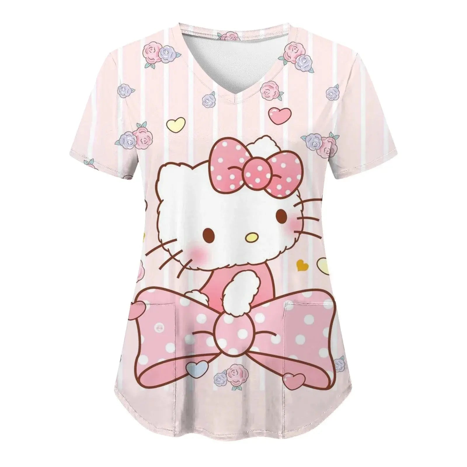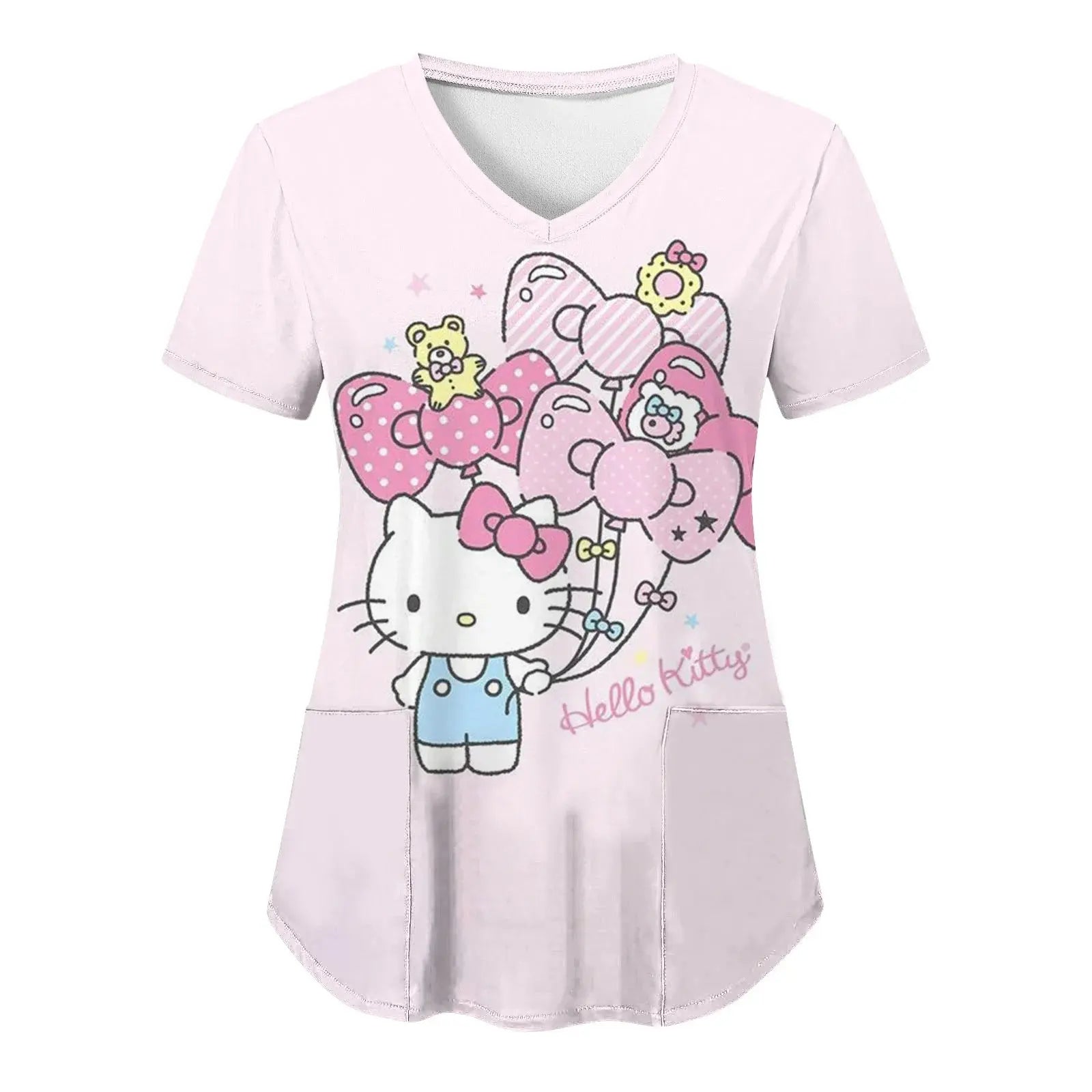 Mettez de la joie et du confort dans votre quotidien : ce haut à manches courtes pour femmes, avec une encolure en V et des imprimés Hello Kitty assortis dans un style cartoon, est parfait pour les infirmières, les médecins ou les tenues d'hôpital décontractées.