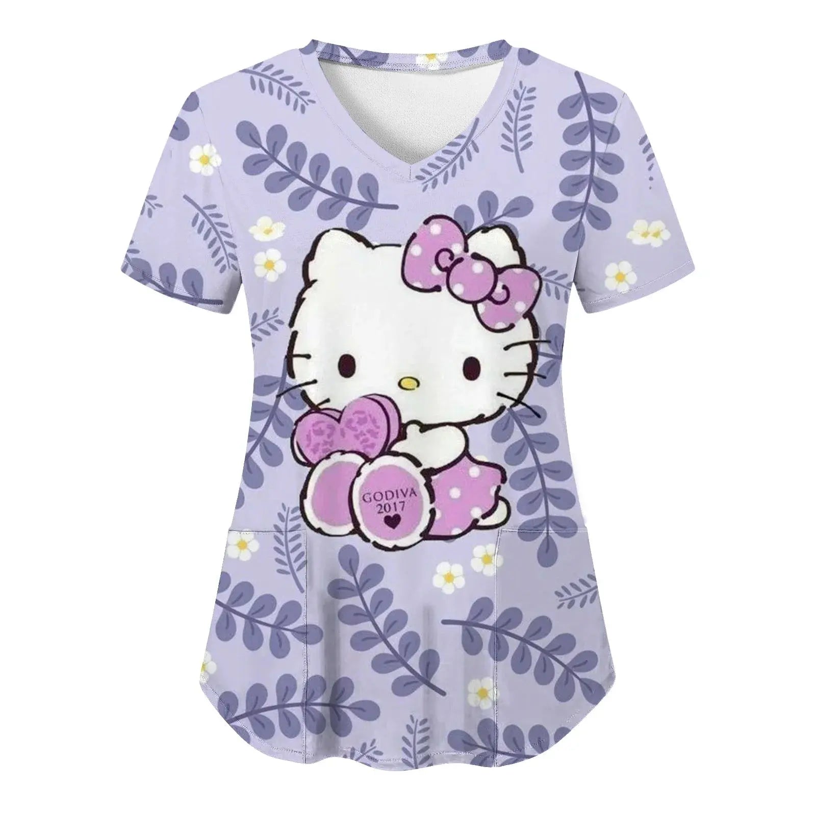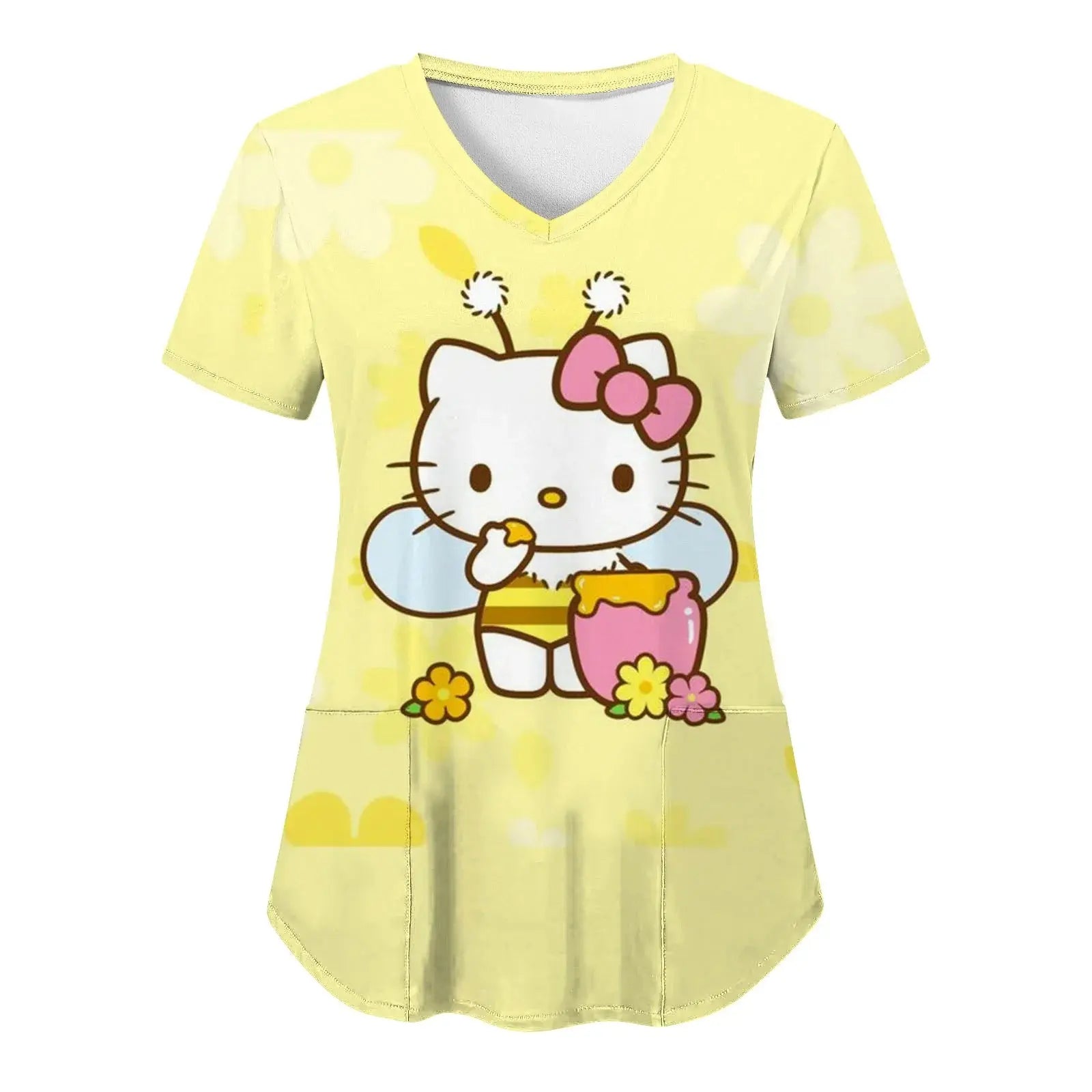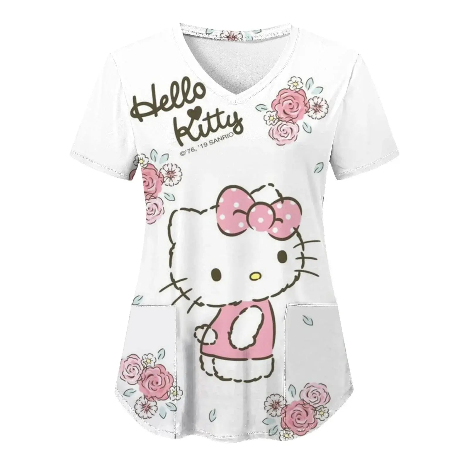 Mettez de la joie et du confort dans votre quotidien : ce haut à manches courtes pour femmes, avec une encolure en V et des imprimés Hello Kitty assortis dans un style cartoon, est parfait pour les infirmières, les médecins ou les tenues d'hôpital décontractées.
