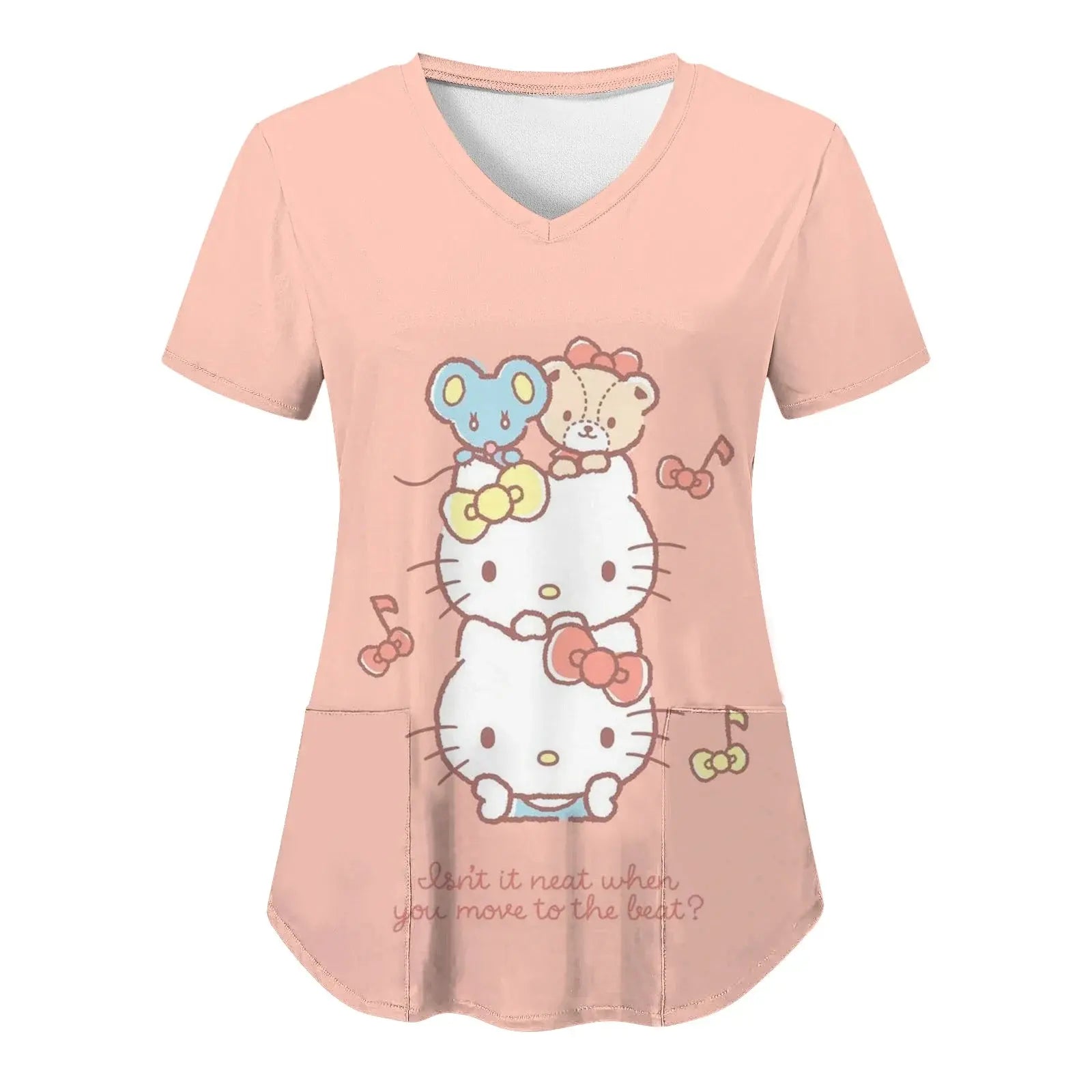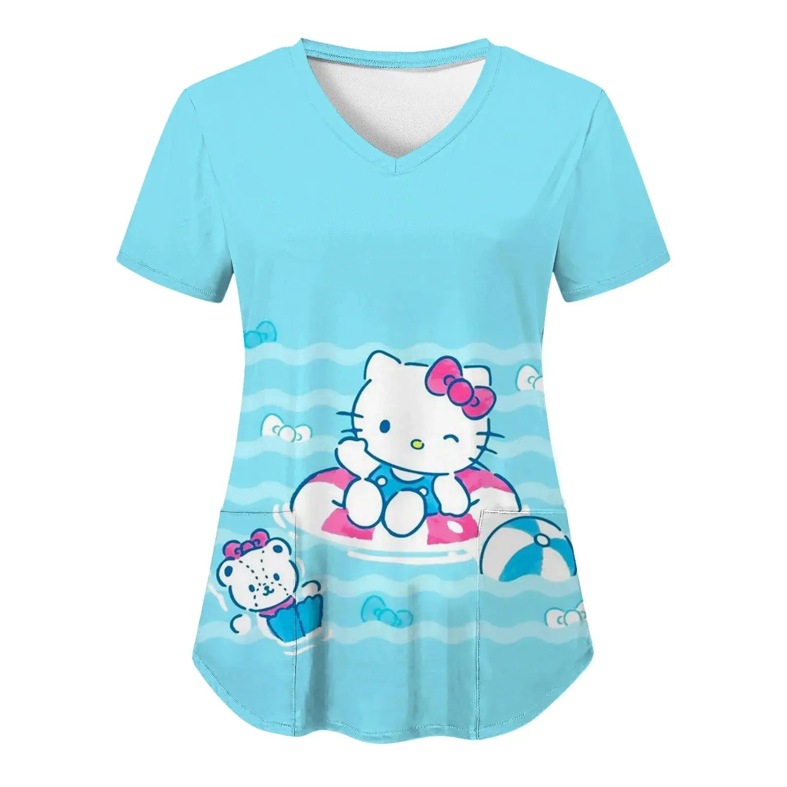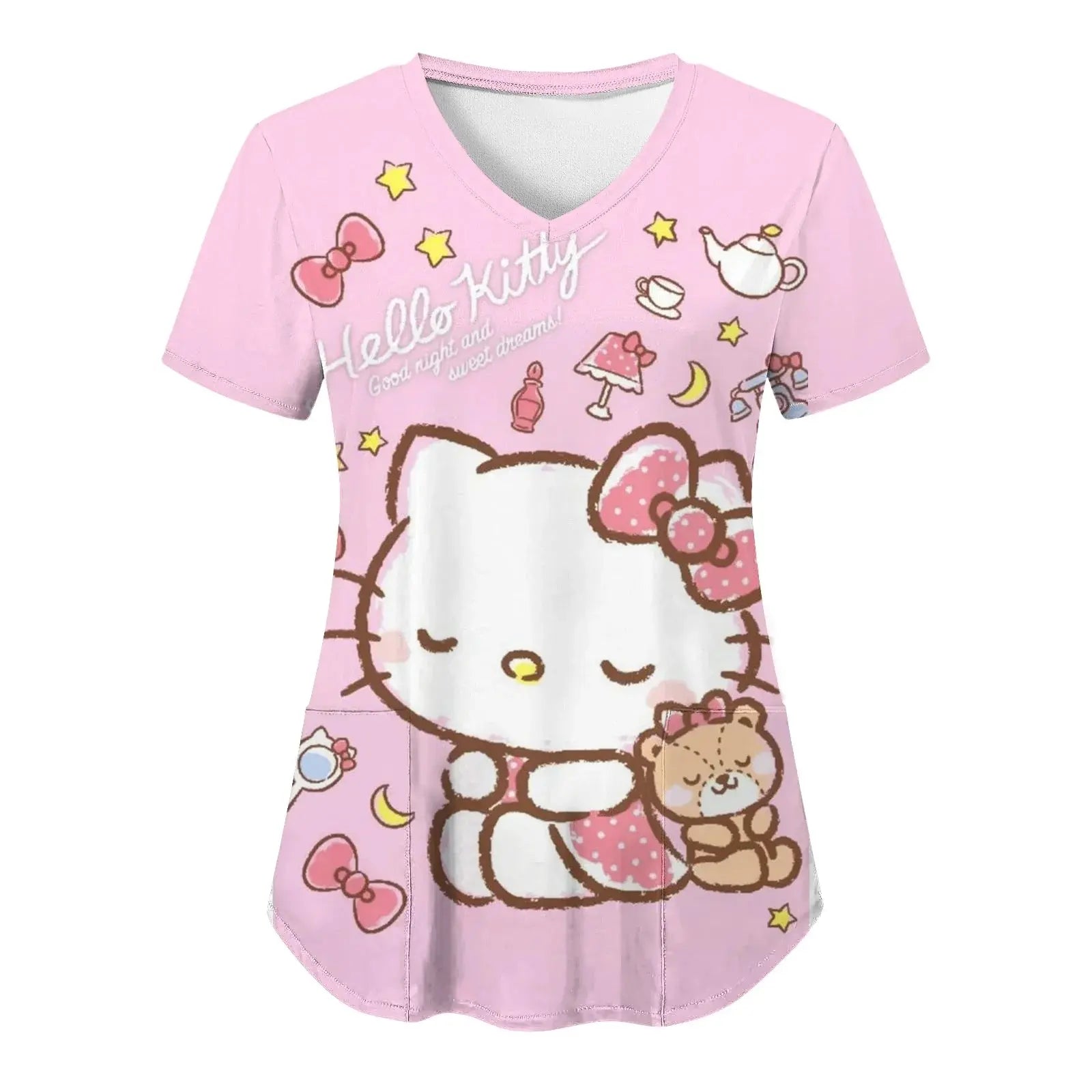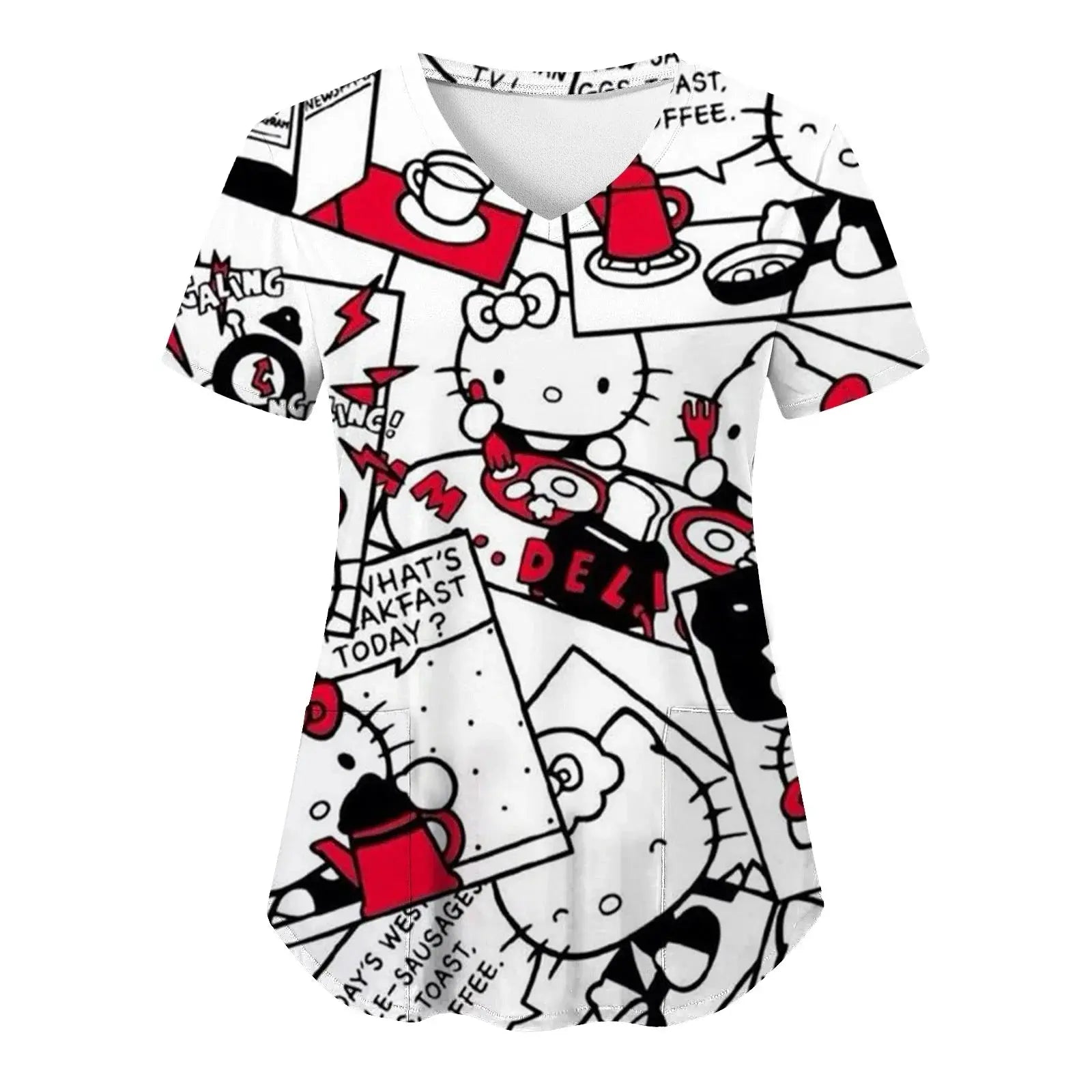 Mettez de la joie et du confort dans votre quotidien : ce haut à manches courtes pour femmes, avec une encolure en V et des imprimés Hello Kitty assortis dans un style cartoon, est parfait pour les infirmières, les médecins ou les tenues d'hôpital décontractées.